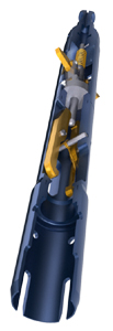 Спускатель состоит из корпуса и механизма захвата и освобождения. Корпус спускателя состоит из трех соединенных с помощью метрических резьб частей. Верхняя часть корпуса оканчивается ниппельной присоединительной резьбой для крепления ловильной головки с устройством закрепления проволоки. Механизм захвата и освобождения, размещенный в верхней и средней частях корпуса, включает подпружиненные, шарнирно закрепленные коромысла выступами на нижних концах. Коромысла служат для удержания якоря за ловильную головку. Нижняя часть корпуса служит кожухом для удержания эксцентрика якоря в транспортном положении и предотвращения преждевременной фиксации якоря в процессе спуска.